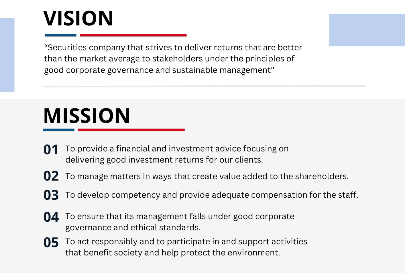 The company and its subsidiaries “the Company” strive to engage in a securities business that can offer a comprehensive or all-in-one service to its clients. To achieve this objective, in the primary market, the Company offers a financial advisory service for a company’s structuring and fund raising while in a secondary market, the Company offers investment advisory service which is supported by the information and analytical research on securities and derivatives prepared by the company’s research department. Apart from the above services, the Company offers a derivative brokerage service in which the Company’s clients can invest in new and innovative derivatives for both investment and hedging purposes. The Company’s objectives classified by their business activities are outlined below.