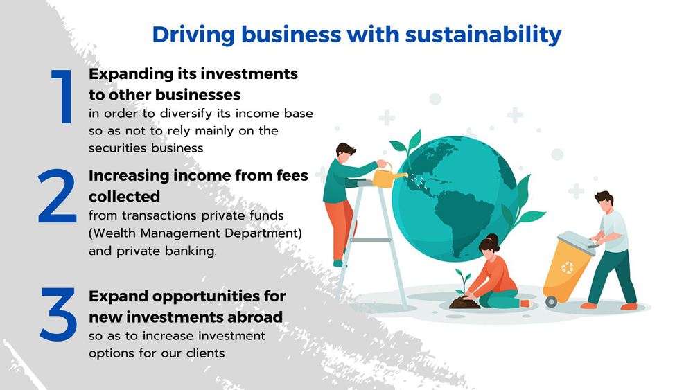 Trinity Securities Group places its emphasis on developing and presenting new and diverse forms of financial services in order to create stable and sustainable growth for the business while providing good yields upon investments for its clients and shareholders and demonstrating concern for environmental, social and governance impact. Moreover, since it is a Holding Company its business movements need to show flexibility and agility to enable various business and investment expansions that can diversity the company’s income structure without having to rely on its main income from the securities business or any one business in particular. During the past year the Trinity Group has launched financial products that correspond with the four main strategies that propel the company’s businesses as follows: