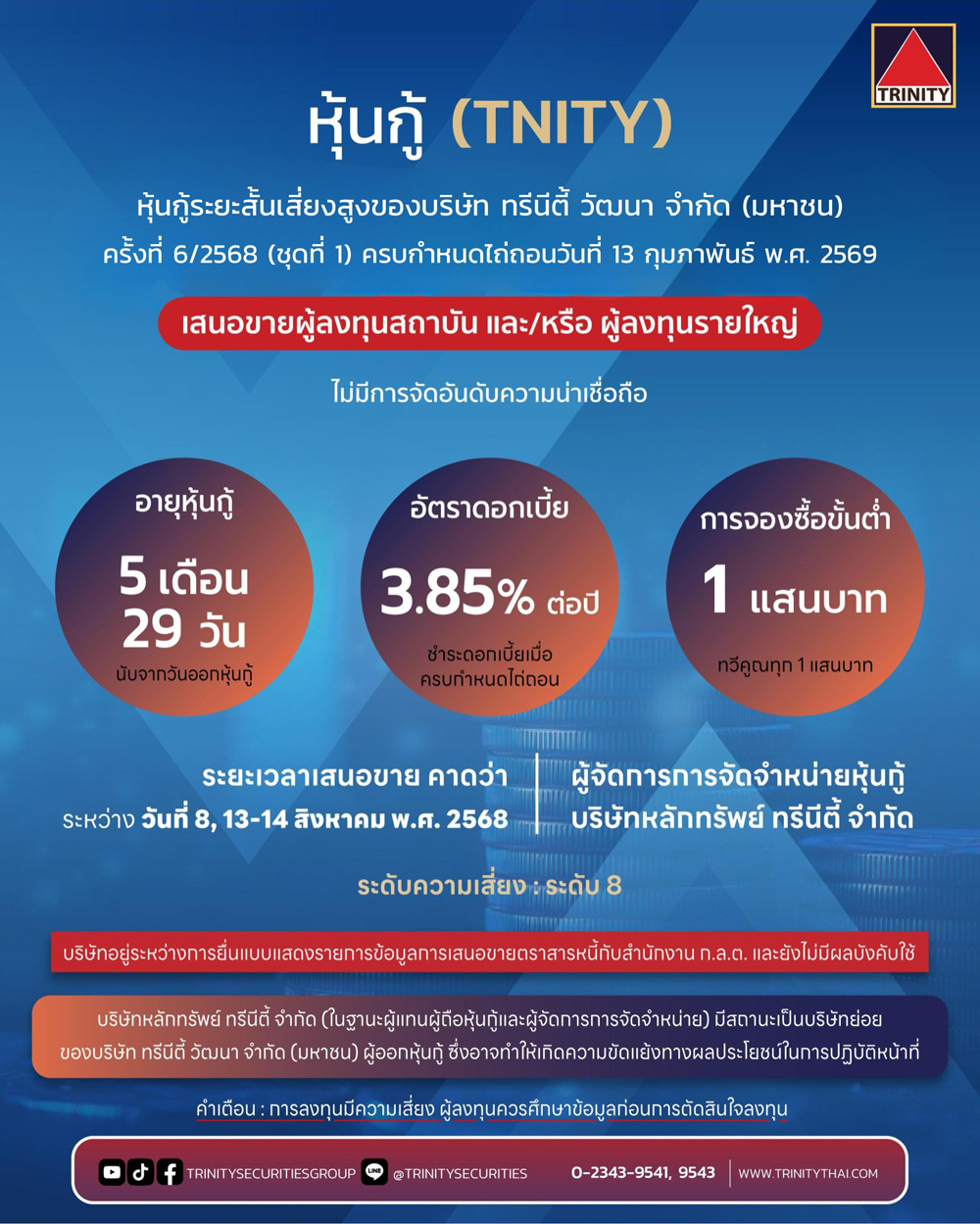 หุ้นกู้ระยะสั้นเสี่ยงสูง ของบริษัท ทรีนีตี้ วัฒนา จำกัด (มหาชน) ครั้งที่ 6/2568
