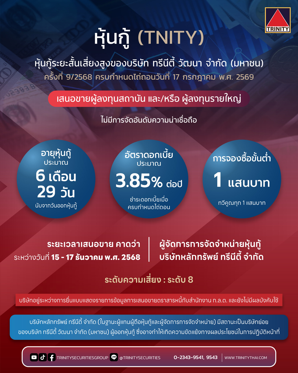 หุ้นกู้ระยะสั้นเสี่ยงสูง ของบริษัท ทรีนีตี้ วัฒนา จำกัด (มหาชน) ครั้งที่ 9/2568