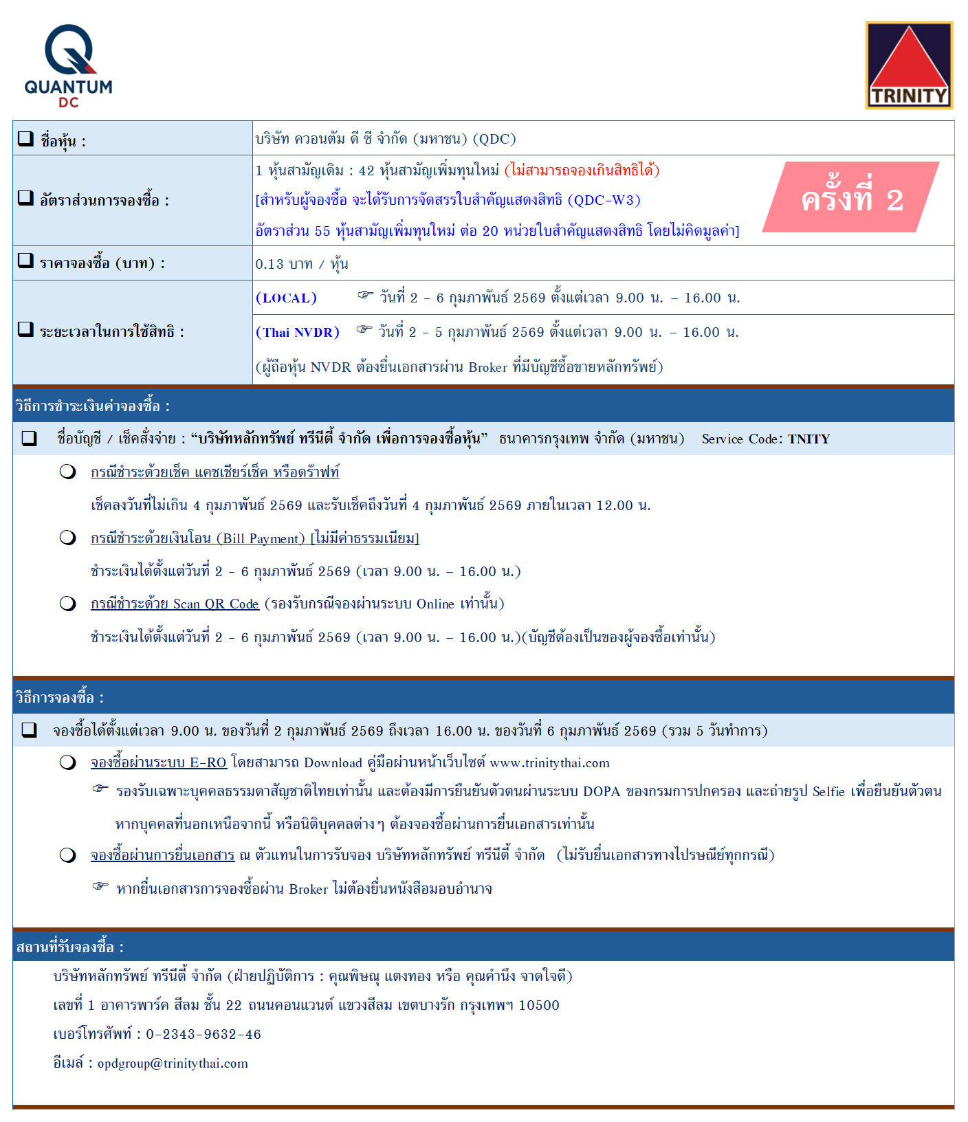การจองซื้อหุ้นเพิ่มทุน บริษัท ควอนตัม ดี ซี จำกัด (มหาชน) - QDC ครั้งที่ 2